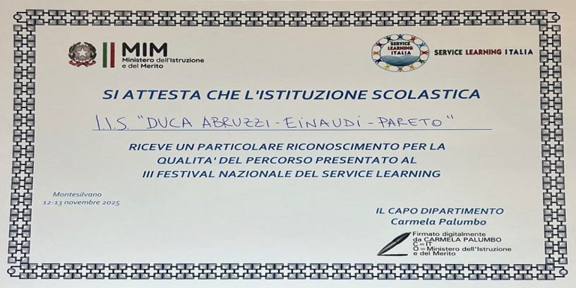 Il 12 e 13 novembre 2025, a Montesilvano d’Abruzzo, si è tenuto il III Festival Nazionale del Service-Learning, un’importante occasione di incontro e confronto che ha riunito esperienze di apprendimento-servizio da tutta Italia. Siamo orgogliosi di essere stati selezionati per rappresentare la Sicilia nella sezione dedicata alla scuola secondaria di secondo grado con il progetto “Dall’arte di esistere a… Costruire il profilo di comunità: narrare la comunità e il suo futuro” (classe V C – AA.SS. 2023-2025 – IIS Einaudi-Pareto), che ha valorizzato il lavoro compiuto in questi due anni nel quartiere Borgo Vecchio e ha celebrato l’impegno di studenti e docenti nel costruire ponti tra persone, saperi e realtà.